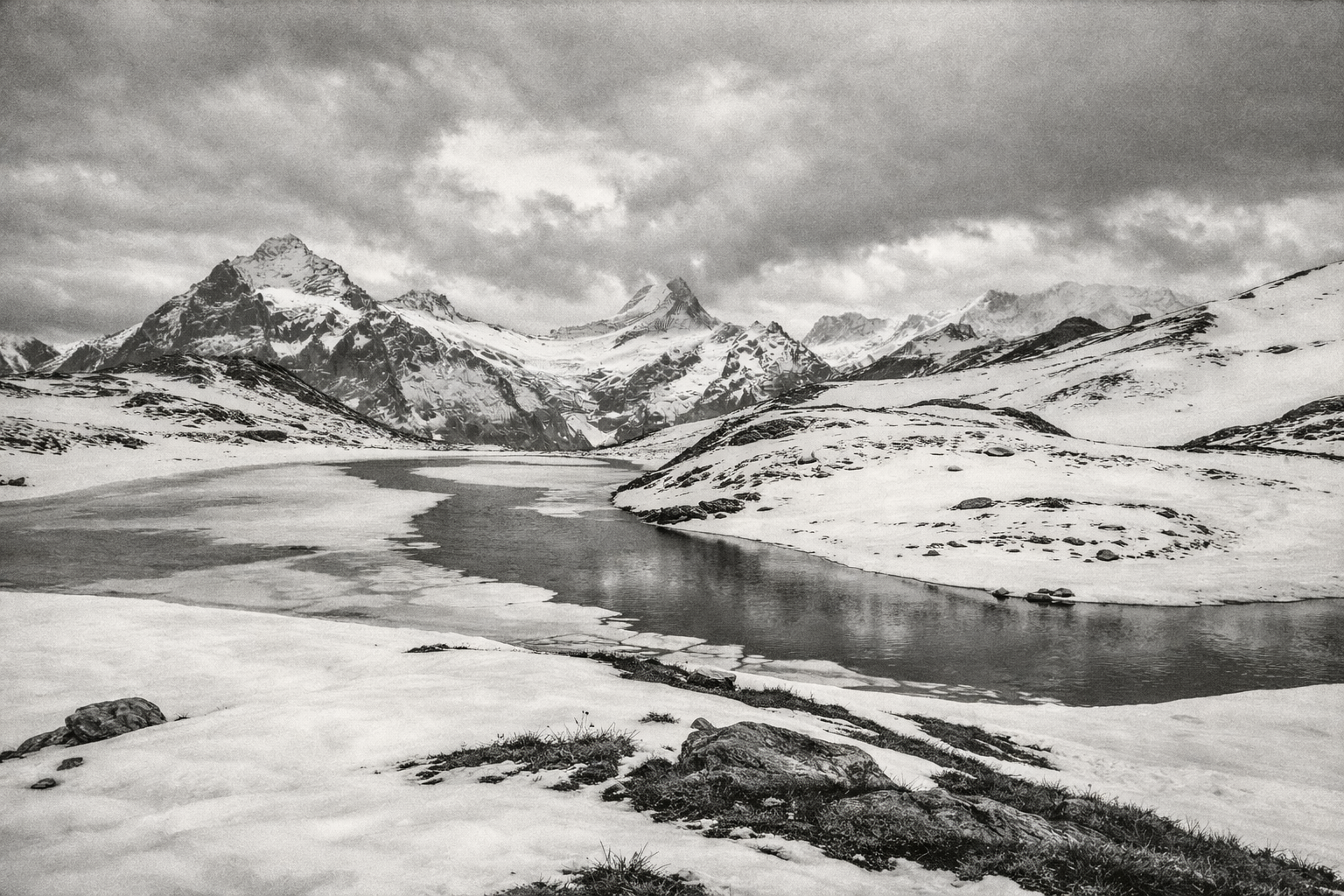 Featured image: The bleak alpine landscape of Jungfrau, Mönch and Eiger deep in a May afternoon, with the frozen waters of Bachalpsee in the foreground. The absence of people and the muted tones give the image an almost monochrome quality, despite being a colour photograph.